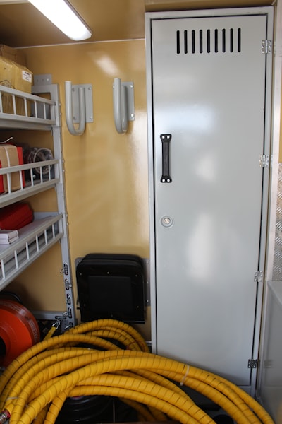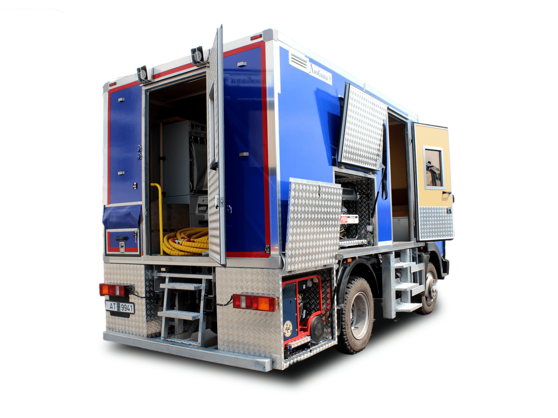 Автомобиль специальный грузопассажирский с кузовом-мастерской для проведения аварийно-восстановительных работ на сетях водоснабжения "суточный" режим работы. Шасси - МАЗ-4570W1-442-010Р1. Размеры фургона (ДхШхВ, мм): 4250х2500х2140. Фургон изготовлен из цельной для каждой из сторон сэндвич-панели с внутренним теплоизолятором, толщиной 40 мм. Теплопроводность теплоизолятора 0,032 Вт/(м*С). Панели не поддерживают горение и не выделяют токсичные продукты. Соединение панелей осуществлено с обязательной гидроизоляцией межпанельного шва. Наружная обшивка фургона из армированного стекловолокном полимера с ровинговой тканью, устойчивого к ультрафиолетовому излучению, повышенной механической стойкости. В автомобиле-фургоне обеспечено разделение фургона сплошной перегородкой на отсеки: пассажирский и технологический. Отопление отсеков - автономными дизельными отопителями мощностью 5 кВт. Между кабиной и фургоном установлена стационарная телескопическая осветительная мачта с пневматическим приводом и управляемым поворотным основанием. Для входа в пассажирский отсек под дверью расположена лестница, имеющая поворотные ступени, работающие от пневмопривода, фиксаторами в транспортном и рабочем положении. Внутри пассажирского отсека: у левой стены отсека по ходу движения – столик для принятия пищи, с откидной крышкой и механизмом фиксации в поднятом положении. Под крышкой столика расположена ниша пенального типа для хранения и перевозки документации, электрических фонарей и зарядных устройств к ним. По ходу движения за столиком, установлены 3 посадочных места пассажиров, соответствующих правилам по безопасной перевозке. Против хода движения, у передней стенки фургона, установлены 3 посадочных места, соответствующих правилам по безопасной перевозке пассажиров с поднимающимся сиденьем и местом хранения инструмента. Комплектация оборудованием технологического отсека: лестница алюминиевая односекционная, мотопомпа бензиновая грязевая, удлинители на катушке, электрогенератор бензиновый, разгонщик фланцев механический, вентилятор, прожектор светодиодный, набор слесарного инструмента, гидрооборудование (гидростанция бензиновая, гидравлический отбойный молоток, комплект стальных наконечников для отбойного молотка, гидравлическая отрезная пила, гидравлическая погружная помпа, бензогенератор). ![]() Фургоны на базе МАЗ Если вы хотите купить автомобиль специальный с кузовом-мастерской для городских коммунальных служб , вы можете:
