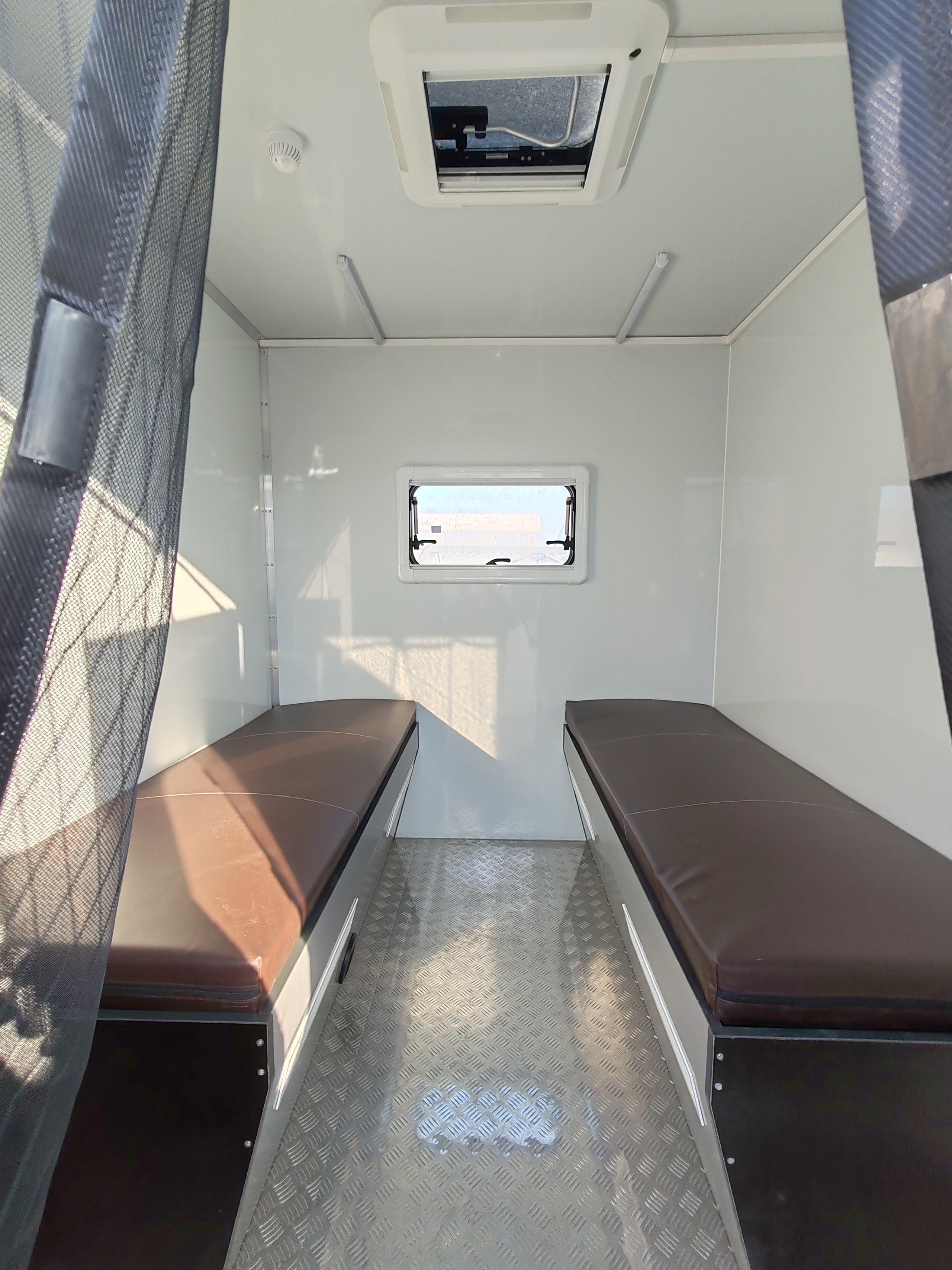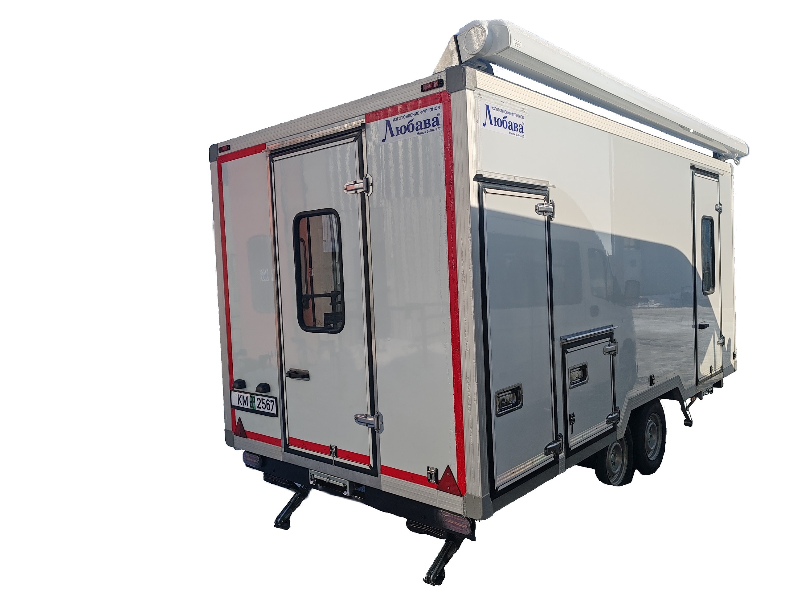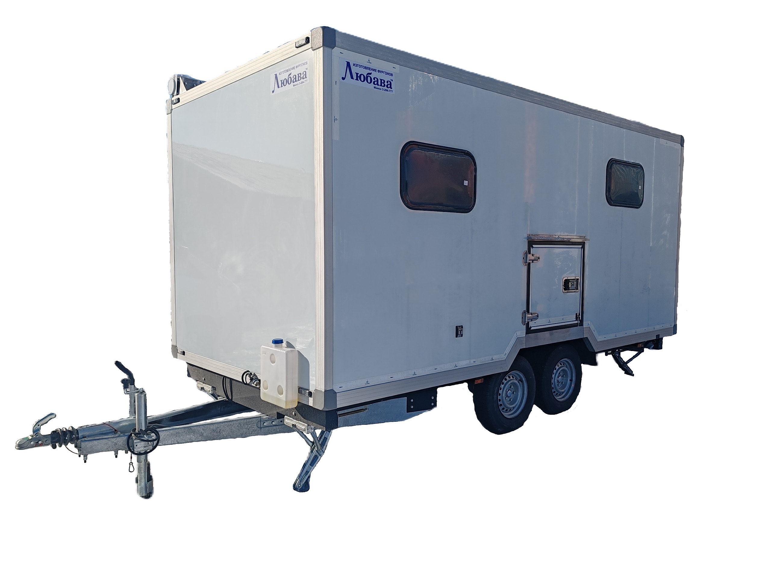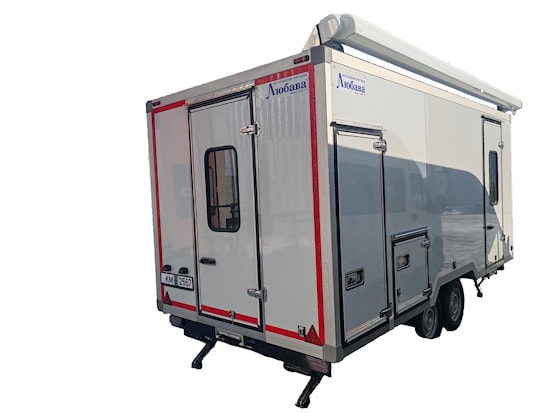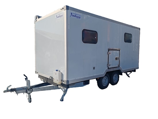 Полная масса -2200 кг. Снаряженная масса -1950 кг · Кузов прицепа выполнен из сэндвич-панелей; · Наружная обшивка – пластик; · Внутренняя обшивка – стеклопластик; · Окантовка кузова – алюминиевый профиль; · Два отсека: в техническом отсеке и в жилом на полу рифленый алюминий, москитные сетки на окнах; люках, двери; Комплектация: · Две входные двери (в дверях глухие окна), со ступеньками (ступеньки оцинкованные); · Две скамьи/ 6 посадочных мест; · Ниша снаружи с выдвигающимися тисками, над ней подсветка; · Шкаф внутренний с полками и выдвигающимися полками для инструмента; · Шкаф-ниша, открывающаяся наружу (650х650х1500мм); · Генератор 7,5 кВт (возможность подключения сварочного инверторного аппарата) с системой выдвижения; · Заточной станок; · Один вентиляционный люк; · Окна ПВХ 2 шт. (открывающиеся) в 1-ом отсеке и во 2-ом отсека; · Щиток без счетчика + бортовой ввод; · Отопитель 4 кВТ с раздувкой на 2 отсека; · Автономное водоснабжение (2 канистры по 20 л); · Водонагреватель наливной; рукомойник; Маркиза-козырек.