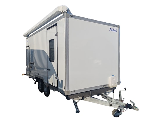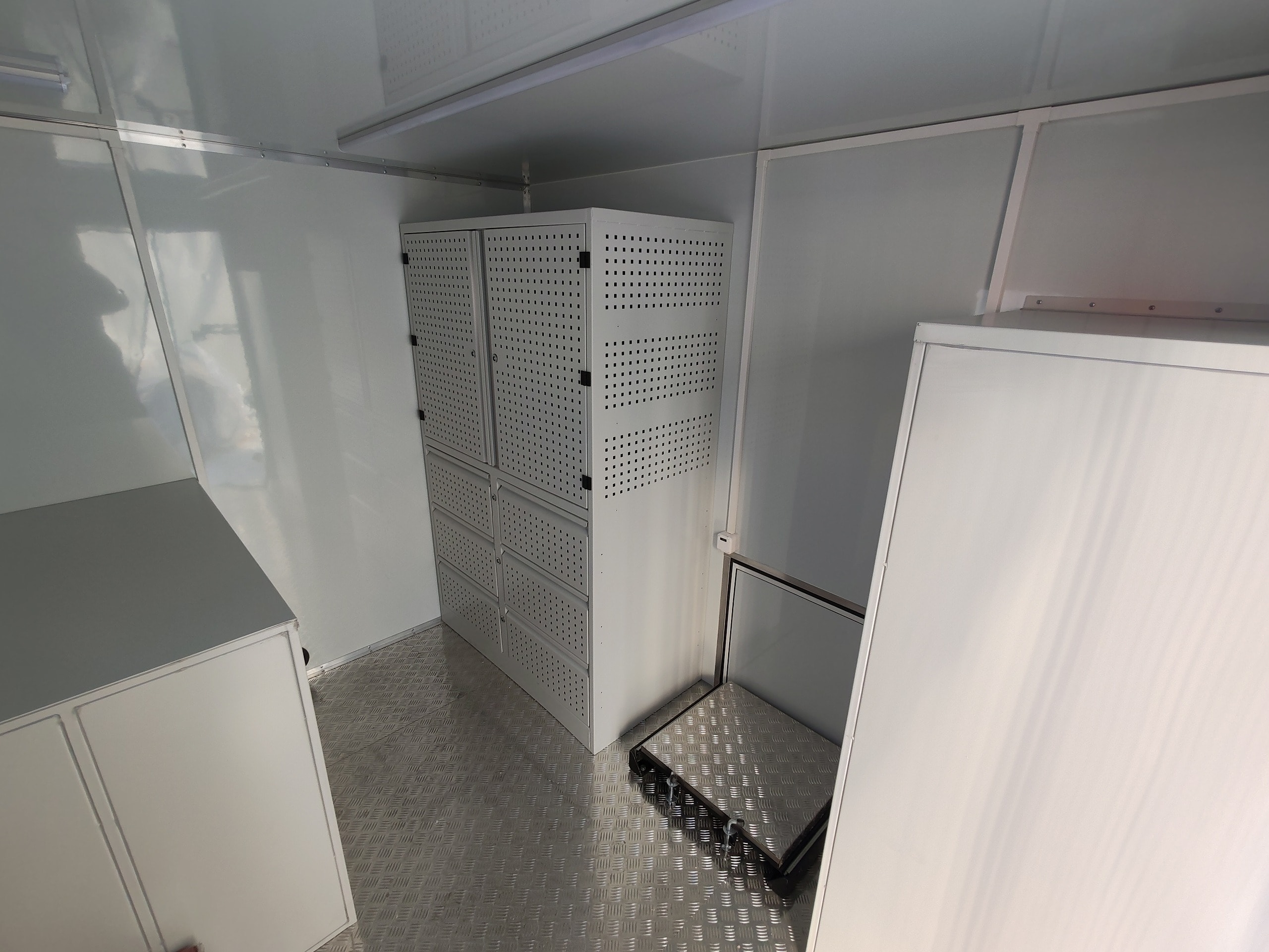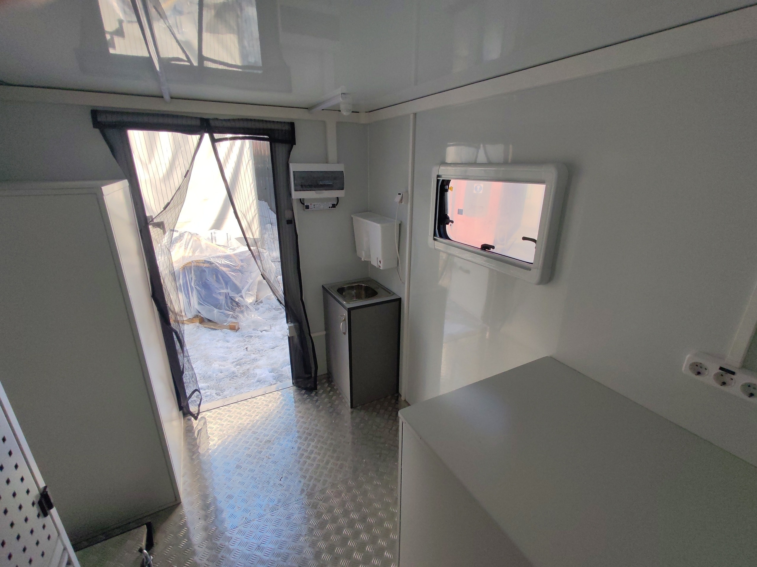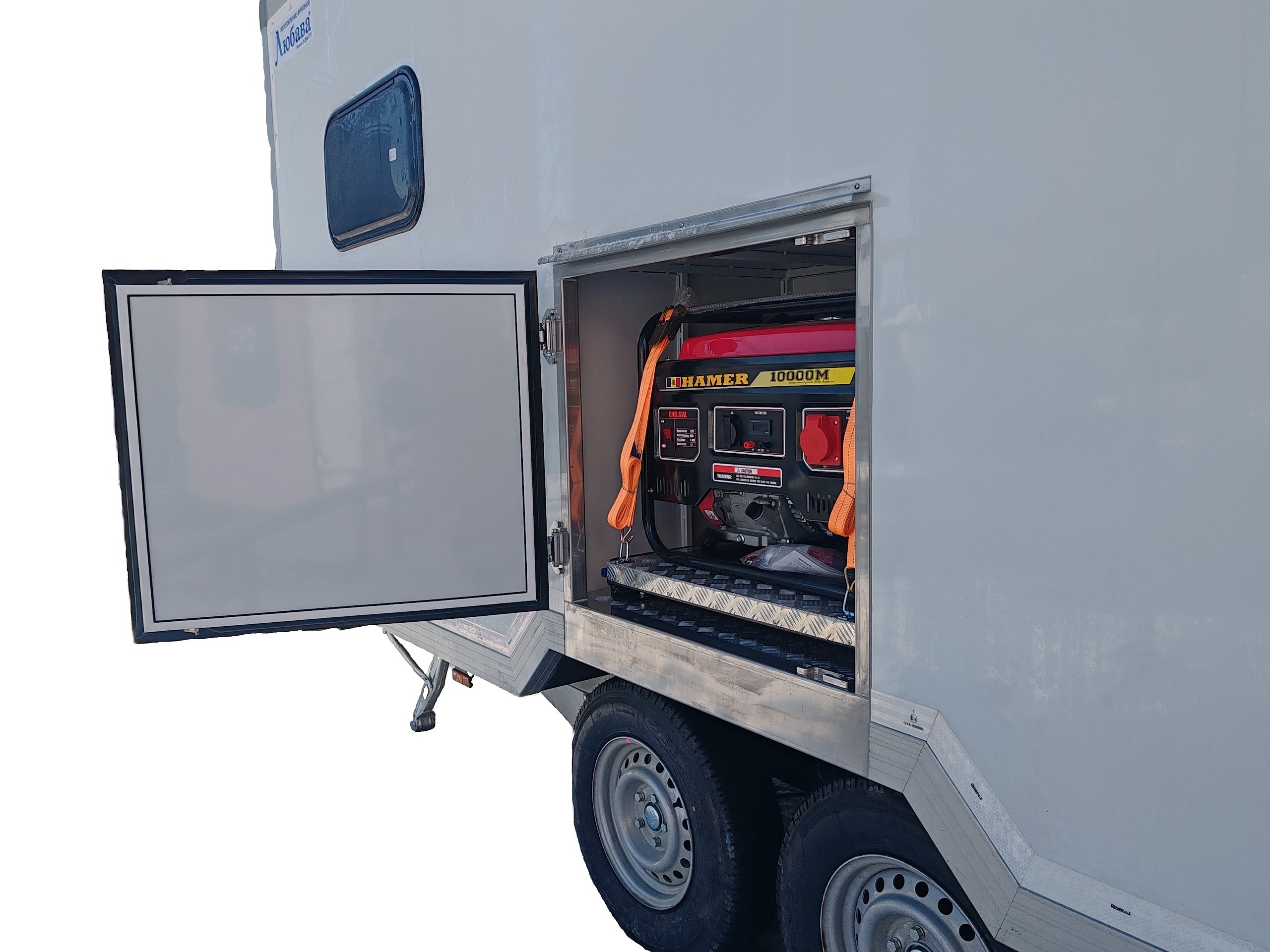 Полная масса -2200 кг. Снаряженная масса -1950 кг · Кузов прицепа выполнен из сэндвич-панелей; · Наружная обшивка – пластик; · Внутренняя обшивка – стеклопластик; · Окантовка кузова – алюминиевый профиль; · Два отсека: в техническом отсеке и в жилом на полу рифленый алюминий, москитные сетки на окнах; люках, двери; Комплектация: · Две входные двери (в дверях глухие окна), со ступеньками (ступеньки оцинкованные); · Две скамьи/ 6 посадочных мест; · Ниша снаружи с выдвигающимися тисками, над ней подсветка; · Шкаф внутренний с полками и выдвигающимися полками для инструмента; · Шкаф-ниша, открывающаяся наружу (650х650х1500мм); · Генератор 7,5 кВт (возможность подключения сварочного инверторного аппарата) с системой выдвижения; · Заточной станок; · Один вентиляционный люк; · Окна ПВХ 2 шт. (открывающиеся) в 1-ом отсеке и во 2-ом отсека; · Щиток без счетчика + бортовой ввод; · Отопитель 4 кВТ с раздувкой на 2 отсека; · Автономное водоснабжение (2 канистры по 20 л); · Водонагреватель наливной; рукомойник; Маркиза-козырек.